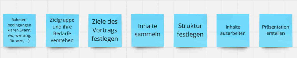 Schauen wir uns das an einem Beispiel an: der Erstellung einer Präsentation. Zuerst zerlege ich meinen bewährten Prozess in kleine, überschaubare Einzelschritte. Das könnte folgendermaßen aussehen:
