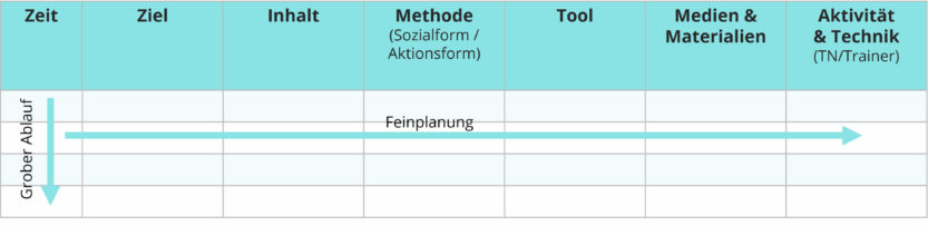 Wenn du noch neu in der Planung von Online-Seminaren bist, dann füge dir zusätzlich auch noch eine Spalte für Aktivitäten & Technik ein. Damit kannst du dir die Komplexität im Umgang mit Tools und Technik bewusst machen und du weißt, worauf du bei der Durchführung besonders achten bzw. welche Sequenzen du besonders gut anleiten solltest.